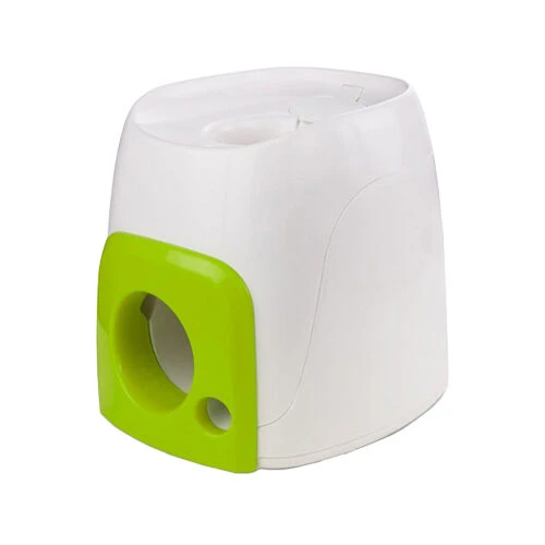 Mit dem All For Paws Interactive Fetch’N Treat ist der Hund stundenlang beschäftigt. Das Hundespielzeug besteht aus einer Box mit je einer Öffnung an der Ober- und an der Vorderseite. Sobald der mitgelieferte Tennisball in die obere Öffnung hineinfällt sorgt ein eingebauter Mechanismus dafür, dass der Ball an der Vorderseite wieder herausrollt. Der Ball wird also nicht herausgeschossen! Gleichzeitig öffnet sich in der Box eine kleine Luke und einige Futterbrocken rollen heraus. Der Sinn und Zweck des Spielzeugs ist, den Hund so gut zu trainieren, dass dieser das System begreift und die Anwendung erlernt. Auf diese Weise kann der Hund sich selbst für das Apportieren und Abliefern des Tennisballes belohnen.