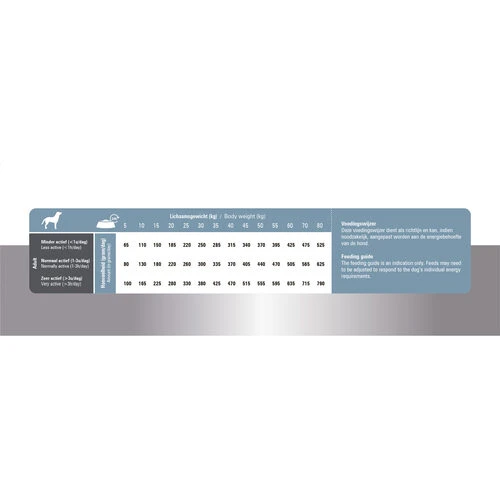 Getrocknetes Hühner- und Truthahnfleisch (19%), Mais, Sorghumhirsemehl, Weizen, tierisches Fett (Rind), getrocknete Zichorie, Maiskleber, Maltodextrin, Geflügelproteinhydrolysat (1,5%), Kartoffelstärke, Lachsöl (0,5%), Inulin, Sonnenblumenöl, hydrolysierte Hühnerleber (0,25%), Hefe, Glucosamin (0,05%), Chondroitin (0,05%)