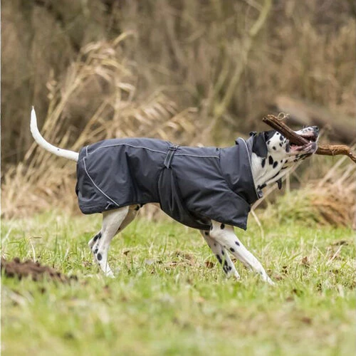 Der Mantel hat einen extra hohen Kragen mit Kordelzug und zwei wasserdichte Reißverschlüsse zum Anleinen am Halsband oder Geschirr. Der gesamte Mantel ist mit Kordelzügen versehen, damit er sich so gut wie möglich an Ihren Hund anschmiegt.
